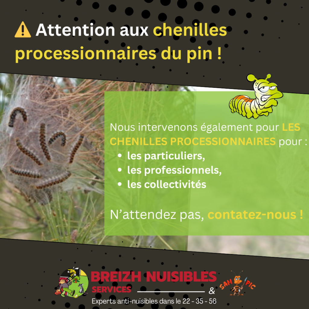 ⚠️ Attention aux chenilles processionnaires du pin ! Un danger réel pour l’homme et les animaux 🐕🐛Leurs poils urticants peuvent provoquer brûlures, allergies et réactions graves. ✅ Faites appel à un professionnel qualifié BREIZH NUISIBLES SERVICES vous accompagne pour :✔️ Diagnostic✔️ Installation d’éco-pièges✔️ Prévention autour de votre habitation 📍 Point de vente – Lorient📌 66 […]