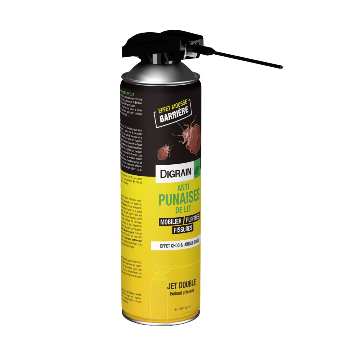 Le aérosol anti punaises Digrain Anti Punaises permet de traiter les surfaces telles que planchers, plinthes, meubles, lattes, sommiers ou pieds de lit.